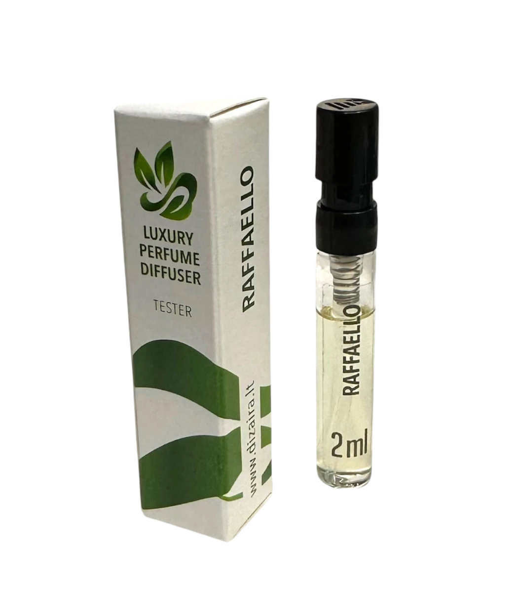 „Raffaello“ – tai elegantiškas, šviesus ir gurmaniškas aromatas, primenantis subtilų saldumą bei rafinuotą gėlių švelnumą. Pirmasis įspūdis – lengvas, vaisiškai gaivus, su saulėtu bergamočio ir švelnių citrusų prisilietimu. Jį praturtina gėliški tonai – rožės, levandos ir ylang-ylang, sukurdami šilkinį, prabangų širdies dvelksmą.