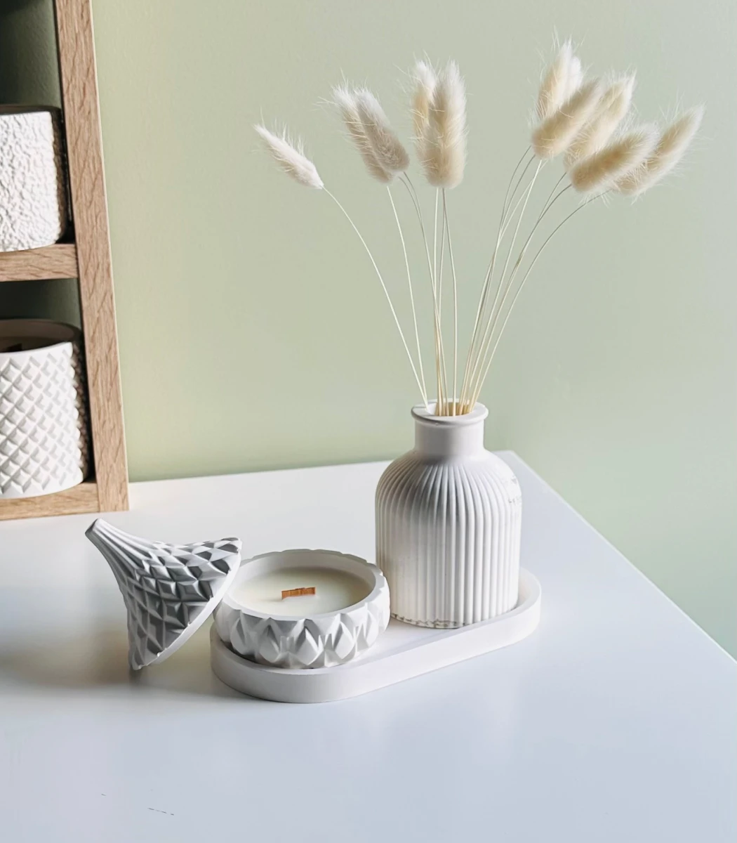 Elegantiškas žvakių komplektas su padėkliuku – tai puikus interjero akcentas, suteikiantis jaukumo ir šilumos kiekvienam namų kampeliui. Komplekta sudaro, žvakė, vazelė su sausomis gėlytėmis, ir visa tai papildo stilingas padėkliukas, užtikrinantis saugumą ir estetiką. Idealus pasirinkimas romantiškai atmosferai kurti, dovanai ar jaukiems vakarams sukurti.