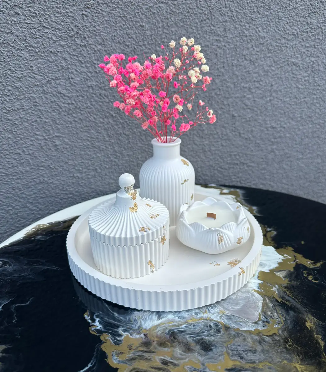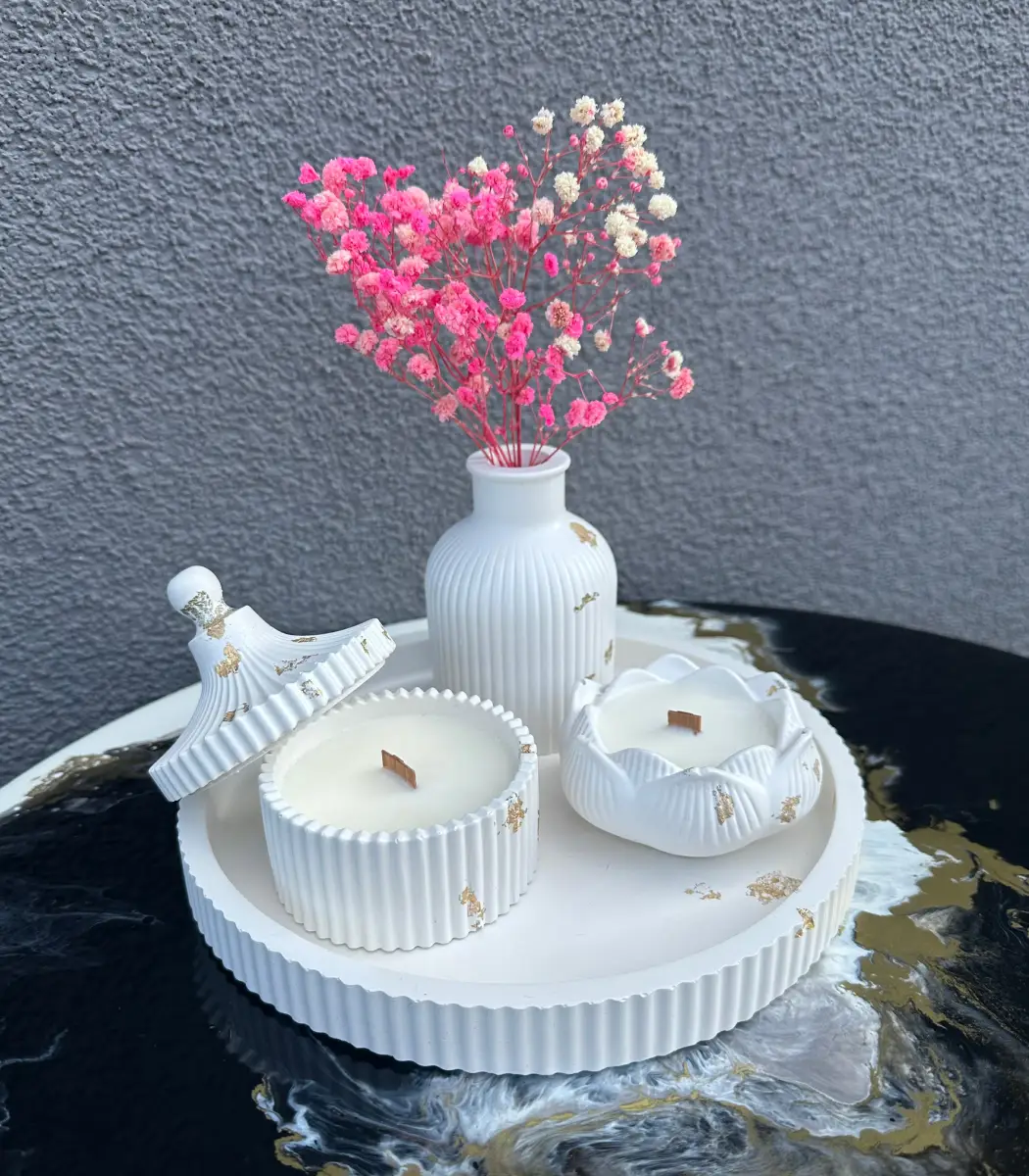Elegantiškas žvakių komplektas su padėkliuku – tai puikus interjero akcentas, suteikiantis jaukumo ir šilumos kiekvienam namų kampeliui. Komplekta sudaro, žvakė, vazelė su sausomis gėlytėmis, ir visa tai papildo stilingas padėkliukas, užtikrinantis saugumą ir estetiką. Idealus pasirinkimas romantiškai atmosferai kurti, dovanai ar jaukiems vakarams sukurti.